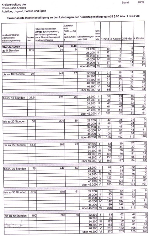 Bei Anmeldung über das Jugendamt des Rhein-Lahn-Kreises berechnet dieses die für Sie anfallenden Kosten der Tagespflege anhand der beigefügten Tabelle. Ich werde dann vom Jugendamt bezahlt. Wenn Sie sich ohne das Jugendamt anmelden fallen separate Kosten für Sie an, welche Sie bitte bei mir erfragen. Die durch Sie zu entrichtenden Kosten für die Bereitstellung von Essen und Trinken entnehmen Sie den unten aufgeführten Preisen nach Bedarf.